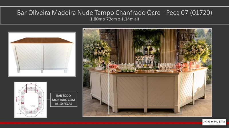 Bar Oliveira Madeira Nude Tampo Chanfrado Ocre - 5m larg x 6m comp x 1,14m alt_Bar Completo com 10 peças