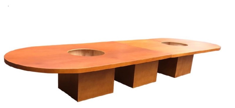 Mesa Bools Pé Ferro Aço Corten Tampo Madeira Natural Ameboide - 3,60m x 1,50m x 85cm alt