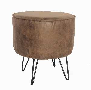 Puff Santiago Pés Ferro Preto Assento Couro Marrom Redondo