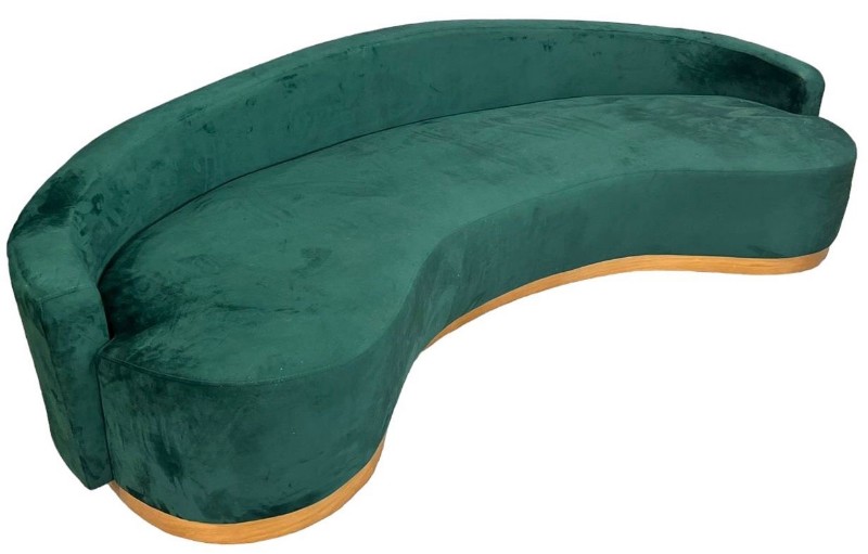 Sofá Curvo Veludo Verde Esmeralda com Base Madeira e 4 Almofadas